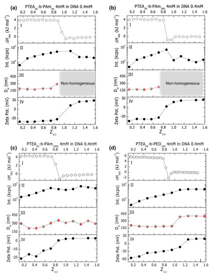 Calorimetric titrations of DNA solutions with (PTEA)-b-(PAm) were performed to investigate the energetics of binding. Figure 1a–c show the integrated heats of reaction plotted against Z+/-. For the addition of (PTEA)-b-(PAm) to DNA, in the presence of NaCl 5.0 mM, the enthalpy of interaction (ΔH) is around 4.0 kJ mol−1 expressed per mole of added copolymer in each injection and is constant and endothermic up to Z+/− value around 0.85. This means that this complex formation is entropically driven, probably due to the release of water molecules and counterions that occurs when the opposite charged chains bind. The order of magnitude of these enthalpy changes agrees with previous determination for the interaction of other oppositely charged polymers, suggesting a general behavior [7,38]. Similarly, for (PTEA)96-b-(PEO)100, ITC experiments showed that the interaction is also endothermic with larger values of enthalpy of binding (ΔH) around 5.5 kJ mol−1 expressed per mole of added copolymer in each injection when compared to the (PTEA)-b-(PAm) copolymers and that it remains constant up to Z+/− of 0.83 (Figure 1d).