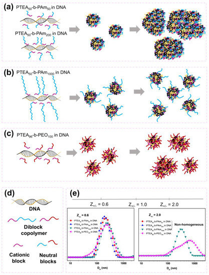 Illustration of the mechanism of interaction for the addition of (a) (PTEA)50-b-(PAm)50, (PTEA)50-b-(PAm)200, (b) (PTEA)50-b-(PAm)1000, and (c) (PTEA)96-b-(PEO)100 into DNA solution. (d) Schematic representation of the macromolecules studied: (e) DLS results as a function of charge ratio, at Z+/− = 0.6 and 2.0, for the polyplexes studied.