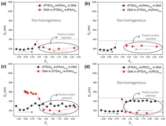 Polyplexes were also prepared by titrating DNA into the copolymer solution in a reverse direction as previously used, and their sizes were compared to those prepared by titrating copolymer to DNA in Figure 5. As discussed before, the direct titration, that is, the addition of copolymers (PTEA)50-b-(PAm)50 and (PTEA)50-b-(PAm)200 into DNA (curves in black), led to precipitation at Z+/− approximately ≥ 1.0, while (PTEA)50-b-(PAm)1000 and (PTEA)96-b-(PEO)100 generated finite-sized structures. For the addition of DNA in the copolymers (red curves, reverse direction), at Z+/− ≤ 1.0 (excess of DNA), precipitation was observed except for (PTEA)50-b-(PAm)1000. The delivery efficiency of a polyplex is improved whenever it possesses positive charge because it can interact with negatively charged cell membranes, and they are internalized to the cell via endocytosis [45]. After that, DNA must dissociate from the complexes to be released into the cytoplasm and conducted into the nucleus [45]. Polyplexes with approximately 200 nm displaying positive surface potential were obtained by adding DNA to all cationic copolymers. Upon the addition of (PTEA)50-b-(PAm)1000 to DNA, it was possible to obtain polyplexes with positive surface potential; however, the size of the formed polyplexes was in the order of 400 nm, whereas polyplexes of around 200 nm were obtained when DNA was added to (PTEA)50-b-(PAm)1000. This observation stresses the importance of selecting the preparation protocol for producing DNA polyplexes.