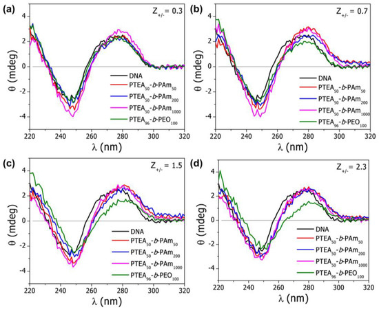 Circular dichroism (CD) was used to evaluate whether there were changes of DNA conformation induced by the addition of the cationic copolymers. The CD spectrum of DNA solution shows a positive band near 275 nm and a negative band close to 245 nm related to the stacking of DNA bases and to the helical structure of DNA, respectively (Figure 6). Upon addition of (PTEA)-b-(PAm), at Z+/- = 0.3, the DNA secondary structure is not significantly affected independently of the copolymer although a red shift of the peak position is observed at Z+/- = 0.7 and 1.5, which is similar to that observed in previous studies [25,46]. At Z+/- = 2.3, there is no observable change on the DNA structure, which may indicate that the interaction is mainly electrostatic considering that hydrogen-boding interaction is expected to modify the CD profile [20]. On the other hand, (PTEA)-b-(PEO)100 induces changes in the DNA secondary structure in accordance with its strongest interactions with DNA, corroborating the previously discussed ITC results.
