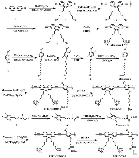 The synthetic routes of monomer 1, monomer 2, monomer 3, PFE-NHBOC-1, PFE-NHBOC-2, PFE-DOX-1 and PFE-DOX-2.