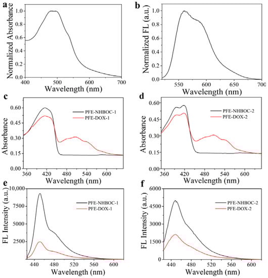 (a) Normalized absorption spectrum and (b) normalized fluorescence spectrum of DOX. Absorption spectra of conjugated polymers (c) PFE-NHBOC-1 and (d) PFE-NHBOC-2 before and after DOX modification. Fluorescence spectra of (e) PFE-NHBOC-1 and (f) PFE-NHBOC-2 before and after DOX modification.