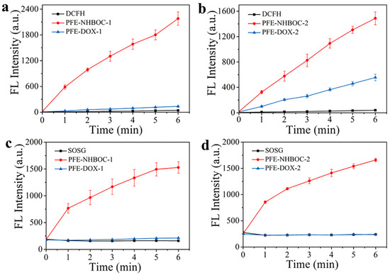 Fluorescence intensity of DCFH at 525 nm in the presence of (a) PFE-NHBOC-1 and PFE-DOX-1 and (b) PFE-NHBOC-2 and PFE-DOX-2 under white-light irradiation (5 mW cm−2) for 0–6 min: [polymer] = 1 μM; [DCFH] = 40 μM; λex = 488 nm. Fluorescence intensity of SOSG at 525 nm in the presence of (c) PFE-NHBOC-1 and PFE-DOX-1 and (d) PFE-NHBOC-2 and PFE-DOX-2 under white-light irradiation (5 mW cm−2) for 0–6 min: [polymer] = 1 μM; [SOSG] = 1 μM; λex = 504 nm.