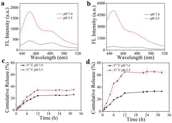 The fluorescence spectra of PFE-DOX-1 and PFE-DOX-2 were recorded before and after the drug release process in order to determine the fluorescence recovery effect of these polymers induced by drug release. These polymers were reacted in PBS buffer with the same ionic strength but different pH values, followed by the detection of their fluorescence intensity. The drug loading rates of PFE-DOX-1 and PFE-DOX-2 are 14.0% and 12.9%, respectively. As illustrated in Figure 4a,b, the emission intensity of the conjugated backbone at 450 nm showed a distinct increase for both the PFE-DOX-1 and PFE-DOX-2 solutions at pH 5.5 after the drug release process, which was much higher than that of the polymer solutions at pH 7.4. Thus, this pH-dependent fluorescence recovery in PFE-DOX-1 and PFE-DOX-2 enables them to realize the real-time monitoring of drug release. In particular, the fluorescence recovery performance of PFE-DOX-2 after DOX release in acidic conditions is superior to that of PFE-DOX-1, which may result from the lower molecular weight and the better water solubility of PFE-DOX-2, leading to the more efficient acid hydrolysis of the acylhydrazone bond.