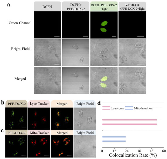 Apart from drug release for chemotherapy, ROS production from the as-prepared polymer in tumor cells also plays a crucial role in synergistic chemo-/PDT therapy. The intracellular ROS generation capability of PFE-DOX-2 was investigated by using DCFH-DA as an indicator. MCF-7 cells were first incubated in the medium containing PFE-DOX-2, and then the cells were treated with DCFH-DA to evaluate the ROS production effect by detecting the fluorescence intensity. As shown in Figure 5a, there was no fluorescence observed in cells incubated with only DCFH-DA. However, bright fluorescence in the green channel was observed after the white-light irradiation of cells that were treated with both PFE-DOX-2 and DCFH-DA, whereas no obvious fluorescence was found in the cell group with the absence of light irradiation. Furthermore, the green fluorescence vanished after the addition of Vitamin C (Vc) into the system, since Vc can effectively remove ROS as an inhibitor. Therefore, the intracellular ROS production ability of PFE-DOX-2 has been confirmed, contributing to synergistic chemo-/PDT therapy. In addition, the distribution of PFE-DOX-2 after its cellular uptake was investigated, for which the lysosomes and mitochondria were stained with Lyso-Tracker red DND 99 and Mito-Tracker Deep Red FM, respectively. As illustrated in Figure 5b,c, the fluorescence of PFE-DOX-2 in the green channel showed a better overlap with the fluorescence of lysosomes than mitochondria after incubating the cells with PFE-DOX-2 for 4 h. The Pearson coefficient of PFE-DOX-2 and lysosomes is 53%, which is much higher than that of mitochondria (23%), indicating that PFE-DOX-2 mainly accumulates in lysosomes upon its cellular uptake (Figure 5d).