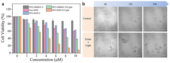After white-light irradiation (25 mW cm−2, 30 min), PFE-NHBOC-2 displayed significant cytotoxicity against MCF-7 cells, and cell viability was reduced to 38% when the concentration of PFE-NHBOC-2 was increased to 10 μM. Noteworthily, the viability of cells co-incubated with PFE-DOX-2 was impressively reduced under white-light irradiation, which was as low as 10% with the concentration of PFE-DOX-2 at 10 μM. The cytotoxicity of PFE-DOX-2 under light irradiation is higher than that of light-irradiated PFE-NHBOC-2 and free DOX at the same concentrations, proving the excellent synergistic chemo-/PDT therapeutic effect of PFE-DOX-2. Consequently, the satisfactory synergistic therapeutic performance of PFE-DOX-2 is derived from two indispensable elements: the efficient pH-responsive drug release and sufficient light-triggered ROS generation. The synergistic therapeutic effect of PFE-DOX-2 can also be reflected by the cell morphologies before and after the synergistic therapy process. As shown in Figure 6b, well-shaped MCF-7 cells were observed in the blank group with the increase in the incubation time, whereas the generated ROS in the polymer-treated group continued to damage the cancer cells. Damaged cells were found in the cell group treated with PFE-DOX-2 and light irradiation after 6 h, while a large number of cells were necrotic after 12 h. After the incubation of cells for 24 h, the number of necrotic cells was significantly increased. All of these results demonstrate the powerful synergistic therapeutic effect of PFE-DOX-2 on cancer cells.