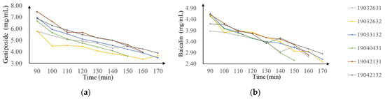 Geniposide and baicalin were fully separated by HPLC. The dynamic curves for two marking components during the alcohol precipitation are displayed in Figure 1. The concentration of geniposide and baicalin was distributed uniformly in the range of 2.74–7.82 mg/mL and 1.76–4.72 mg/mL, respectively. The time evolution curves of the concentration of the two CQAs had similar trends, obviously. With the addition of the alcohol solution, the concentration of substances in the system decreased continuously. But at the same time, it can also be found that the time required for each batch to reach the end of the process was inconsistent. The endpoint of the alcohol precipitation process depends on the alcohol content of the solvent system. For example, the alcohol content of the production batch 19040431 of LOS reached the standard at the 150th minute, while the batch 19042131 sample took 170 min. The process gap was caused by the batch-to-batch fluctuation of the input materials and other process parameters depending on the worker’s experience, such as the rate of addition of the alcohol solution. These factors also caused obvious fluctuations in the concentration of CQAs in different batches of LOS, which demonstrated the importance of process analysis.