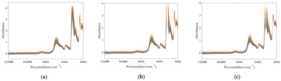 NIR absorbance spectra. (a) the raw NIR absorbance spectra; (b) processed spectra; (c) SG smoothing processed spectra. Different colors represent different samples.