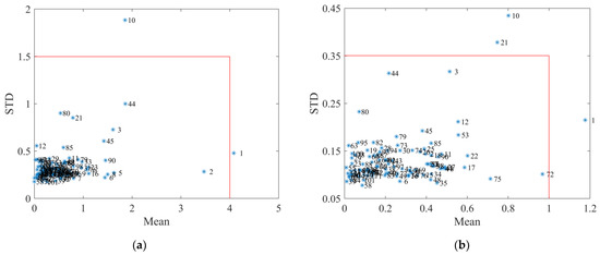 The results of MCCV (a) geniposide; (b) baicalin. Blue asterisks represent different samples.