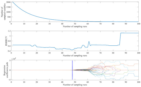 CARS evaluates the importance of variables by the absolute value of the regression coefficients of the local PLSR model. Simulating the survival of the fittest principle of Darwin’s theory of evolution, CARS applies exponentially decreasing function (EDF) and adaptive reweighted sampling (ARS) to forcefully remove wave points with relatively small absolute regression coefficients through multiple modeling and evaluation. At the same time, cross validation was introduced to evaluate the predictive ability of the local model. Finally, the subset of variables with the lowest RMSECV was obtained [26].