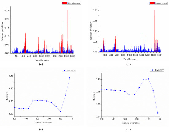 RF variable selection on dataset: (a) selection probability for each variable calculated for geniposide dataset; (b) selection probability for each variable calculated for baicalin dataset; (c) relationship between RMSECV value and number of variables of geniposide dataset (d) relationship between RMSECV value and number of variables of baicalin dataset.