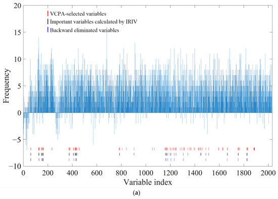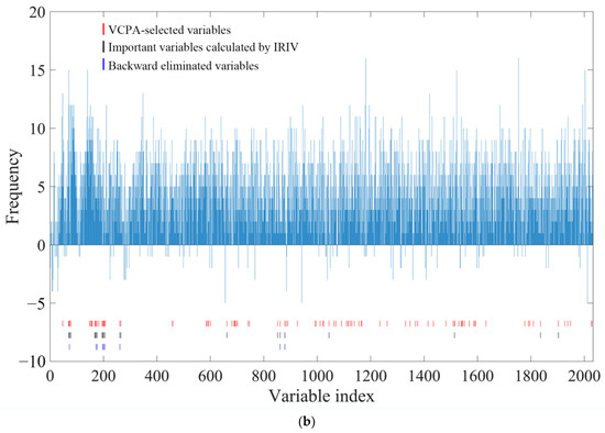IRIV implements the importance ranking of variables by building numbers of local models to calculate the impact of each wave point’s inclusion and exclusion on model performance. During the operation of IRIV, the uninformative and interfering variables are first identified and deleted to form a variable subset consisting of strongly informative and weakly informative variables. Then, further backward elimination will be performed on the obtained subset of variables. In this step, it will be confirmed whether a wave point needs to be deleted according to the change of the RMSECV value of the local model created by removing the variable. IRIV has shown robust predictive capabilities in multiple datasets, but its reliance on local models also poses a computationally expensive drawback [28]. Therefore, Xu et al. proposed that VCPA could be introduced to optimize the calculation of IRIV [29]. Combining the advantages of EDF, binary matrix sampling (BMS), and model population analysis (MPA), VCPA can identify irrelevant variables before IRIV calculation, and shrink the variable space.
