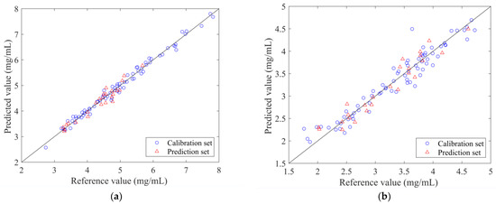 The samples were divided into calibration and prediction sets at the ratio of 3:1 by the SPXY algorithm. Using the x and y variables simultaneously, the distance between samples was calculated to ensure the maximum representation of sample distribution by SPXY [23].