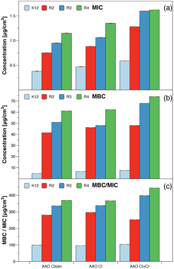 MICs and MBCs were determined using the methodology described previously [20,21,22,23,24,25,26,27,28,29,30] with serial dilutions of 10 1 to 10 7 . In short, the analysed model E. coli strains were grown in a TSB medium and diluted in water. Next, 50 μL TSB medium was inoculated with 10 6 cfu/mL (CFU, colony-forming units, approximately 0.5 McFarland units) of the bacterial strains. Next, the bacteria were transferred onto AAO matrices and incubated with each at a concentration of 1 mM for 24 h at 37 C. Next, 50 μL of the bacterial suspension from all the analysed membranes was diluted to 0.1 mM and plated on a 48-well plate (according to the markings) with resazurin (0.02 mg/mL), which was added to all the wells, as an indicator. The plates were incubated at 30 C for 24 h. Colour changes from blue to pink or yellowish with turbidity were considered positive. The lowest concentration at which there was no visible colour change was set as the MIC.