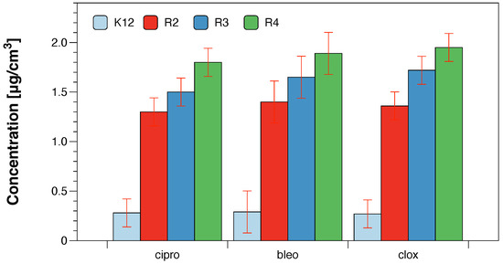 Figure 6. Examples of MIC with model bacterial strains K12, R2, R3, and R4 with ciprofloxacin, bleomycin, and cloxacillin. Each experiment was performed independently in three replications (n = 3).