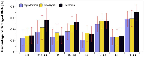 Figure 7. The percentage of bacterial DNA recognised by Fpg enzyme in model bacterial strains after ciprofloxacin, bleomycin, and cloxacillin treatment. The compounds were statistically significant at p < 0.05. Each experiment was performed independently in three replications (n = 3).