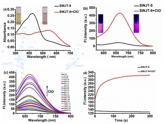 As shown in Figure 1a, the UV–Vis absorption spectrum of SWJT-9 showed an obvious absorption band centered at 430 nm. After the addition of ClO− to the solution, the absorbance red-shifted to about 550 nm. The color of the solution changed from yellow to pink (Figure 1a, inset). These results suggested that a reaction might occur between SWJT-9 and ClO−. In the fluorescence spectrum, SWJT-9 showed weak emission at about 667 nm (Φ = 0.018) under excitation at 550 nm (Figure 1b). After the addition of ClO−, the fluorescence increased (Φ = 0.113) [], and the fluorescence color of the solution was observed from red to deep red (Figure 1b, inset). These results indicated that SWJT-9 could detect hypochlorite anions by colorimetric and fluorescence turn-on responses. The fluorescence titration experiments were then conducted. As shown in Figure 1c, the fluorescence intensity enhanced with the increase of the ClO− concentration, indicating that SWJT-9 was a turn-on fluorescence probe. The detection limit was calculated as 24.7 nM (Figure S6, Supplementary Materials), which was far lower than the concentration of hypochlorite anions produced by cells [].
