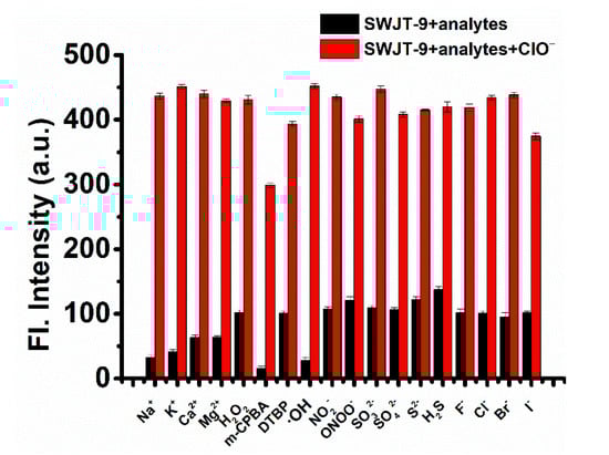 As show in Figure 2, when active oxygen species or other anions were added to the solution of SWJT-9, the fluorescence intensity was still weak. The fluorescence intensity at 667 nm significantly enhanced when ClO− was added to the above solution. These results indicated that the presence of other reactive oxygen species or anions would not interfere with the recognition of ClO− by SWJT-9. The probe had a good anti-interference property and potential application in biological environments.