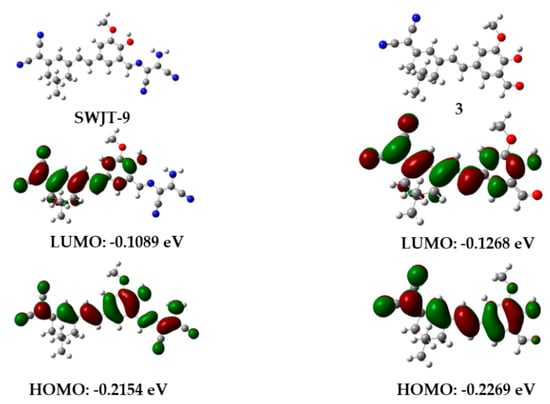 Optimized structures and molecular orbital plots of SWJT-9 and compound 3.