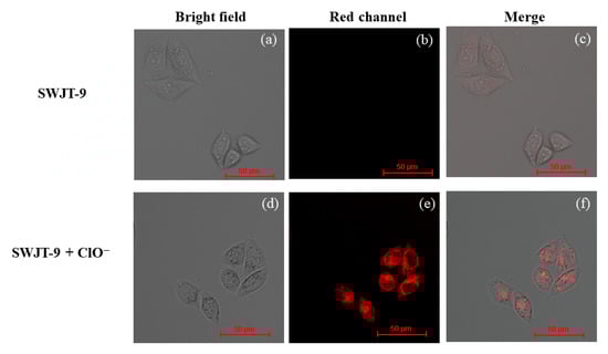 Fluorescence images of HeLa cells. (a–c) SWJT-9 (10.0 μM) imaged with HeLa cells for 30 min; (d–f) HeLa cells incubated with SWJT-9 (10.0 μM) for 30 min, then incubated with ClO− (200.0 μM) for another 20 min (λex = 561 nm).