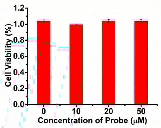 In order to study the effect of organic solvents on the probe, methanol, ethanol, acetonitrile, DMSO, and DMF were used (Figure S4, Supplementary Materials). The effect of the buffer solution and pH on the probe were also studied (Figure S5, Supplementary Materials). According to these results, and considering the solubility of the probe, the solution of ethanol and PBS (9/1, v/v) at pH 7.4 was selected as the test condition.