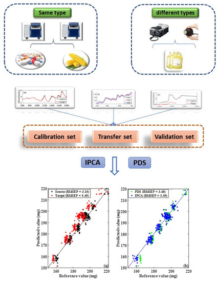 Based on its ability to quantify the physical properties and chemical constituents of samples in one spectrum, near-infrared (NIR) spectroscopy has become a powerful tool for the industrial implementation of process analytical technology (PAT) [1,2,3,4]. Furthermore, establishing a calibration model is an indispensable, even decisive, part NIR spectroscopy’s application; therefore, constructing a robust model always needs to invest a lot of manpower and time. It is much more challenging for manufacturers to guarantee absolute consistency and stability when using two spectrometers. Unavoidable spectral deviation results in the degradation of the calibration model’s prediction performance. Furthermore, in a practical industry scenarios, different types of instruments are often used simultaneously, such as benchtop NIR spectrometers and portable instrument devices [5,6]. Admittedly, the miniaturization, portability, and low-cost characteristics of NIR devices are more conducive to NIR spectroscopy technology’s widespread application. Therefore, developing methods to transfer the existing model to new instruments with different signal-to-noise ratios, spectral resolutions, and wavelengths is a matter of considerable concern [7].