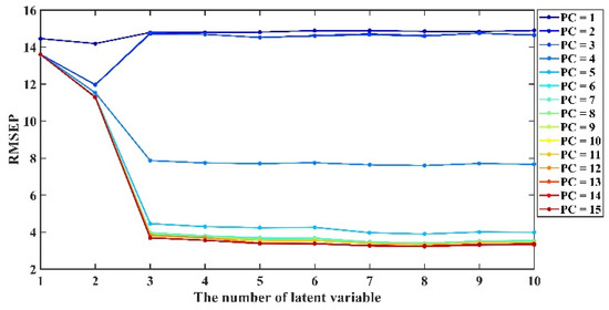 The moving window width and nLV are vital parameters for PDS. Following a previous study [14], a moving window width set at 17 was optimal for PDS, while for IPCA, both the PCs during PCA and nLV are pivotal. Figure 2 shows a visualization of the impact of PC values on the model results, as well as the RMSEP values under different conditions in the calibration transfer from target to source, and there was a considerable difference in results under different LVs and PCs. When the number of PC was set to 1, 2, and 3, the RMSEP value did not change significantly across the entire range of LV values, which indicates that the spectral information’s structure cannot be comprehensively related at low PCs. When PC = 5, the RMSEP value decreases gradually with the increase in LV and stabilizes at about 8 after LV = 3. Additionally, when the PC is set from 6 to 15, the RMSEP value drops sharply at LV = 1–3 and stabilizes after LV = 4, which implies that the PCs play a considerable role during PCA and nLV; therefore, the appropriate choice of crucial parameters can achieve significant improvements in the predictive accuracy of IPCA.