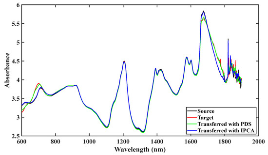 To give more insights into the standardization effect, the spectra measured on the source, target and transferred spectra by PDS and IPCA for an arbitrarily selected sample are displayed in Figure 3. An obvious difference could be observed in the spectral regions of 600–700 nm, 1700–1800 nm, and 1800–1900 nm, and as mentioned above, the spectral ranges from 1800 to 1900 nm were cut off during model establishment owing to richness in noise. After being transferred with PDS, the target spectrum moves closer to the source spectrum with a difference in the range of 600–700 nm and 1700–1800 nm. The IPCA-transferred spectrum seemingly has better overlapping interval regions than the PDS-transferred spectrum. However, a slight difference could also be found in the wavelengths of 600–700 nm and 1700–1800 nm. Therefore, we speculate from Figure 4 that the transfer effect of IPCA is possibly better or comparable to that of PDS. We can infer that the IPCA method can achieve a better approximation of the source instrument spectrum by structurally associating the source instrument’s spectrum with the target instrument spectrum compared with the PDS method.