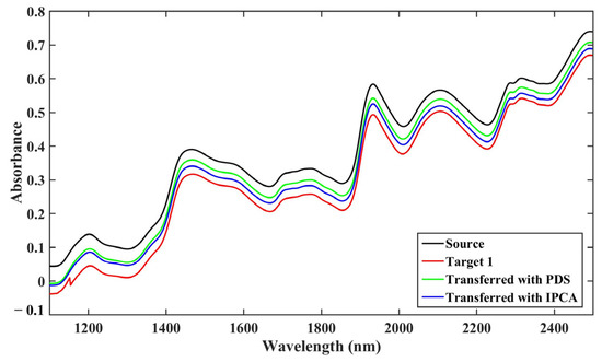 In our study, we collected the spectra of dataset 1 and 2 by the same type of near-infrared spectrometers. Figure 9a shows that changing the instrument resulted in obvious spectral variations in several spectral intervals, especially in the range of 1600–1800 nm. Figure 9b shows that the source spectrometer’s absorbance rate was higher than that of the target spectrometers. However, differences between instruments are unavoidable, which is why the calibration model is not suited for spectra collected by another instrument.