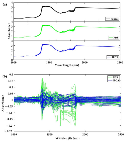 To obtain a further understanding of IPCA method, we investigated the calibration transfer between the two spectrometers in the whole spectral range in the following way: First, we converted the spectra collected by the target spectrometer with PDS and IPCA into the spectra of the source spectrometer in the range of 1000–2500 nm. In order to intuitively compare the transferred spectral differences between PDS and IPCA, we calculated the differences between the spectra by subtracting the transferred spectra from the source spectrometer’s original spectra. The source and transferred spectra, as well as their differences, are displayed in Figure 6. Figure 6a shows that after standardizing with IPCA from the target to the source instrument, the spectra are in excellent agreement with the corresponding spectra collected by the source instrument, which are relatively smooth in the whole spectral range. However, among the two methods, the transferred spectra with PDS have several small fluctuations in the 1000–1100 nm interval, as well as obvious large fluctuations in the 1400–1900 nm interval, especially at 1700–1800 nm, which may be caused by the large absorbance change intensity of the original spectra. This indicates that the quality of transferred spectra with PDS may be positively correlated with the original spectral fluctuation.