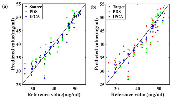 (a) Relationship of reference and predicted value in validation set obtained by (a) source—transferred target (PDS) or (IPCA), (b) target—transferred source (PDS) or (IPCA).