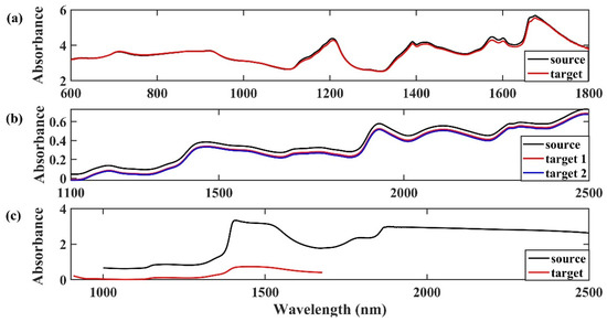 Figure 9c shows the spectra of dataset 3, which were acquired with different types of spectrometers, and the two spectrometers’ spectra display considerable differences in wavelength and absorbance. Based on the FT spectroscopic principle and high-sensitivity InGaAs detector, the source spectrometer’s spectral wavelength range from 1000 to 2500 nm, with absorbance between 0.5 and 3.5. Spectra collected by the target source with a linear variable filter (LVF) as an optical splitter and a 128-line-element InGaAs detector ranges from 908 to 1676 nm, with an absorbance level lower than 0.5. However, the overlapped spectral wavenumbers’ absorbance trends are similar.