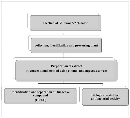 A fresh rhizome of a Z. zerumbet sample was obtained from the local market of Old Lahore (the walled city of Lahore). Following the collection, the rhizomes were washed thoroughly with distilled water, shade dried (one month), and then identified using their vernacular name by the Department of Botany, University of the Punjab, Lahore (voucher Number: LAH#280921). Following the shade drying step, the grinding of the plant was carried out to convert it into a fine powder, approximately 500 g, and the powder was processed for aqueous extraction. The aqueous (distilled water) and 95% ethanol extracts of the bitter ginger rhizome were prepared. Samples of 50 g were extracted for 5 days with 250 mL of the respective solvent, at 40 °C, in a shaking incubator at 200 rpm. Then, the extracts (mixtures) were initially filtered twice with nylon cloth, to remove the solid residue and then were further filtered using a Whatman filter paper. The fresh filtrate was left to evaporate using a rotary evaporator [26,27]. The final weighted extract was transferred to a clean airtight glass bottle and stored at 2 to 8 °C, and processed for the phytochemical analysis, and antibacterial activities (Figure 3).