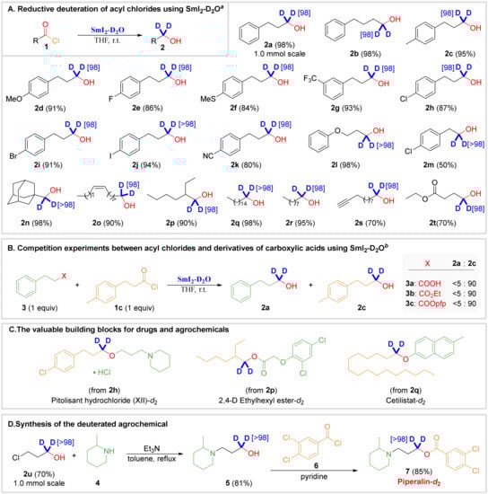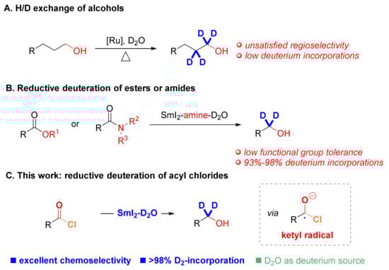 Alcohols are among the most important and broadly utilized building blocks for the synthesis of agrochemicals and drugs [,,,,,,]. Therefore, deuterium-labeled alcohols are valuable in the preparation of deuterated drugs and deuterated internal standards for agrochemical residue analysis. However, the synthesis of deuterated alcohols with high deuterium incorporations and chemoselectivity from readily available starting materials is still not straightforward [,,,,,,,]. Deuterated alcohols can be directly synthesized via the H/D exchange of alcohols (Scheme 1A) [,,,,]. However, metal-catalyzed H/D exchange of alcohols often suffers from either unsatisfied regioselectivity or low deuterium incorporations [,,]. The reductive deuteration of carboxylic acids and their derivatives is another strategy for the synthesis of deuterated alcohols [,,]. Classic reductive deuteration requires the usage of expensive and pyrophoric LiAlD4 or NaBD4 [,]. In our previous work, SmI2-Et3N-D2O-mediated SET reductive deuteration reactions were developed to convert carboxylic acid derivatives into the corresponding deuterated alcohols (Scheme 1B) []. While the usage of Et3N as the ligand improved the reduction potential of SmI2, it decreased the chemoselectivity of those methods [,,,,,]. Et3N can only be avoided by using activated carboxylic acid derivatives, such as uncommercially available pentafluorophenyl esters and acyl fluorides [,]. In this study (Scheme 1C), we discovered that widely available acyl chlorides are more reactive ketyl precursors which are susceptible to SmI2-D2O. The reductive deuteration of acyl chloride is a four-electron transfer process. The ketyl radical shown in Scheme 1C was formed after the first electron transfer. The sequential electron transfers and deuterium cation transfers led to the formation of the deuterated alcohols. In the absence of an Et3N ligand, the reductive deuteration of acyl chlorides by SmI2-D2O gave excellent chemoselectivity and ≥98% deuterium incorporations.