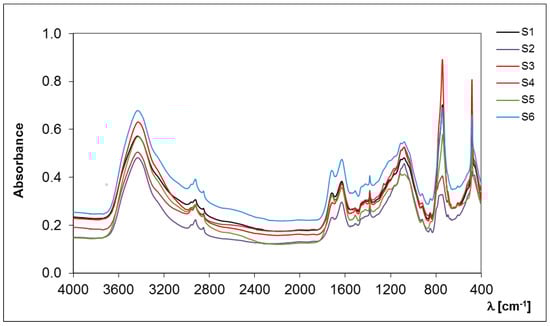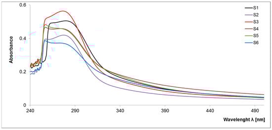 So far, there has been little research into the molecular evaluation of a stable fraction of organic matter due to their non-specific character and the need to develop the appropriate separation methods. The obtained spectra (Figure 1) are characterized by the presence of a specific maximum at high intensity within 250–280 nm, which is not convergent with the previous research on the analysis of organic matter components. Thus, it can be assumed that S-SOM is characterized by a specific pattern of spectra with an expressive maximum at low wavelengths. In the higher wave ranges, spectra are broad, featureless and monotonously decrease with increasing measuring range, similar to the graphs obtained for labile organic matter components, i.e., dissolved organic matter, fulvic acids and humic acids [17,18]. Among all samples, two groups with similar spectral properties emerged in the studied spectral range (S1, S2, S3 and S4, S5, S6, respectively) displaying the same basic pattern of wavelength trend.