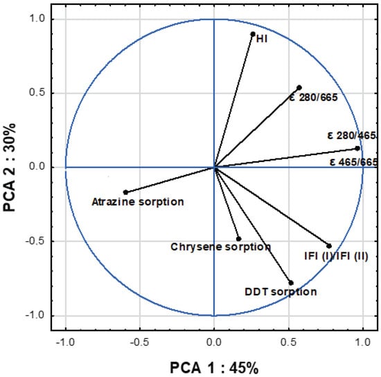 The relationship between molecular features (measured by UV–VIS, FTIR and EEM) and sorption affinity expressed by maximum sorption amount of OCs to separated S-SOM are shown in Figure 4 and Table 5. All analyzed data were represented by three main components, explaining 93% of the total variance of the results (Table 5), whereas up to 75% of the variance was explained by the first two factors (Figure 4). The first PCA component (PCA 1), which accounted for 45% of the variance, was significantly positively correlated with absorbance indices ε 280/465 (r = 0.96), ε 280/665 (r = 0.67) and ε 465/665 (r = 0.96) and fluorescence parameters IFl (I)/IFl (II) (r = 0.78). Moreover, PCA 1 described the sorption of atrazine and 4,4′ DDT (r = 70 and 71, respectively), which indicates that the sorption of these compounds is influenced by similar physicochemical processes, probably related to their spatial structure equipped by radical substituents (Hofmann et al., 2016) contrary to chrysene.