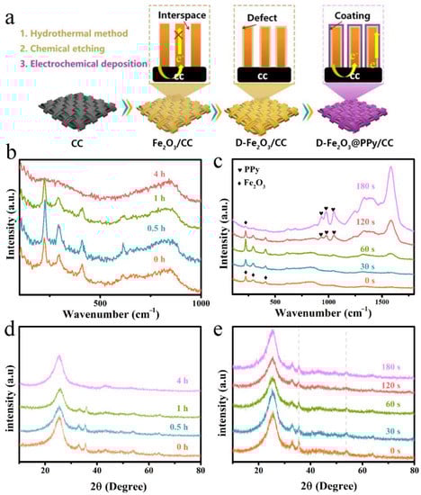 (a) Schematic illustration of the fabrication process of a D-Fe2O3@PPy/CC electrode. Raman spectra of (b) D-Fe2O3-xh (x = 0.5, 1, and 4) and (c) D-Fe2O3@PPy-ys (y = 30, 60, 120, and 180) electrodes. The corresponding XRD patterns of (d) D-Fe2O3-xh and (e) D-Fe2O3@PPy-ys electrodes.