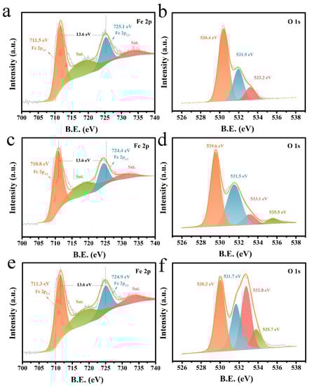 The XPS spectra of Fe2O3/CC for (a) Fe 2p and (b) O 1s regions. The XPS spectra of D-Fe2O3/CC for (c) Fe 2p and (d) O 1s regions. The XPS spectra of D-Fe2O3@PPy/CC for (e) Fe 2p and (f) O 1s regions.