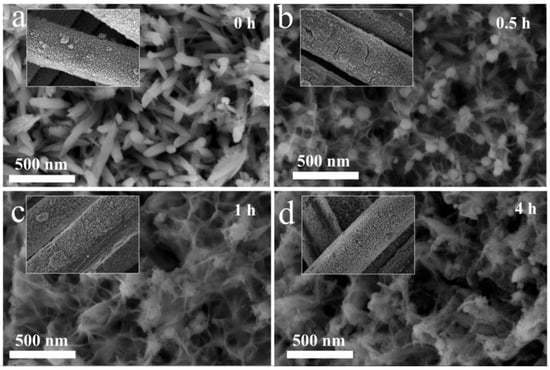 SEM images of D-Fe2O3/CC electrode prepared using different immersion times: (a) pristine Fe2O3, (b) D-Fe2O3-0.5 h, (c) D-Fe2O3-1 h, and (d) D-Fe2O3-4 h.