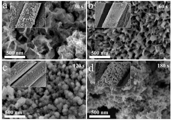 SEM images of D-Fe2O3@PPy/CC electrode prepared using different electrodeposition times: (a) D-Fe2O3@PPy-30 s, (b) D-Fe2O3@PPy-60 s, (c) D-Fe2O3@PPy-120 s, and (d) D-Fe2O3@PPy-180 s.