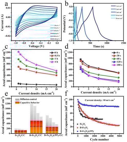 (a) CV curves of D-Fe2O3@PPy/CC (D-Fe2O3@PPy-120 s) at different scan rates. (b) GCD curves of D-Fe2O3@PPy/CC (D-Fe2O3@PPy-120 s) at different current densities. (c) Rate performances of D-Fe2O3/CC electrodes. (d) Rate performances of D-Fe2O3@PPy/CC electrodes. (e) Diffusion and capacitive contributions of Fe2O3/CC, D-Fe2O3/CC (D-Fe2O3-1 h), and D-Fe2O3@PPy/CC (D-Fe2O3@PPy-120 s) electrodes at scan rates of 10, 20, 60, 100 mV s−1. (f) Long-cycling performances at current density of 10 mA cm−1 for 5000 cycles.