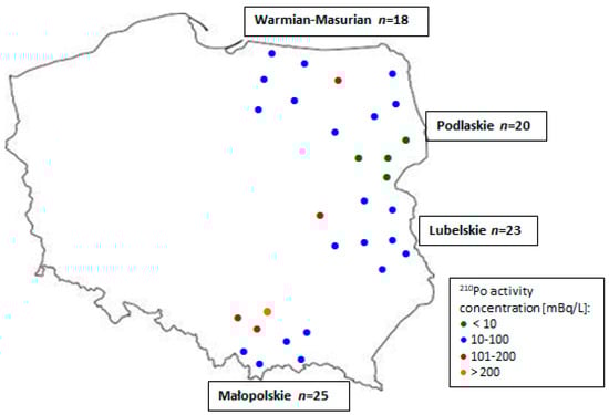 Considering the regional mean values, only those from the Małopolskie and Lubelskie voivodeships did not differ significantly (p ≤ 0.05). However, the 210Po activity concentration in the samples from the Małopolskie voivodeship exceeded 60 mBq/L and ranged from 61.4–221.4 mBq/L (Table 1).