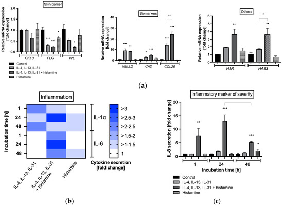 - Fujimoto, S.; Komine, M.; Karakawa, M.; Uratsuji, H.; Kagami, S.; Tada, Y.; Saeki, H.; Ohtsuki, M.; Tamaki, K. Histamine Differentially Regulates the Production of Th1 and Th2 Chemokines by Keratinocytes through Histamine H1 Receptor. Cytokine 2011, 54, 191–199. [Google Scholar] [CrossRef]