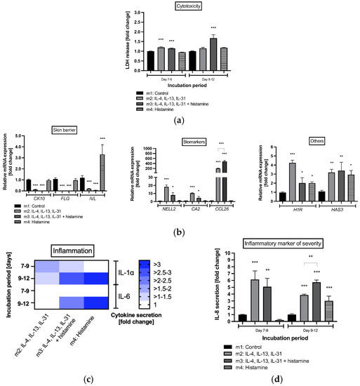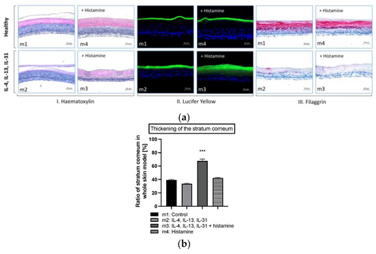 - Gschwandtner, M.; Mildner, M.; Mlitz, V.; Gruber, F.; Eckhart, L.; Werfel, T.; Gutzmer, R.; Elias, P.M.; Tschachler, E. Histamine Suppresses Epidermal Keratinocyte Differentiation and Impairs Skin Barrier Function in a Human Skin Model. Allergy 2013, 68, 37–47. [Google Scholar] [CrossRef]