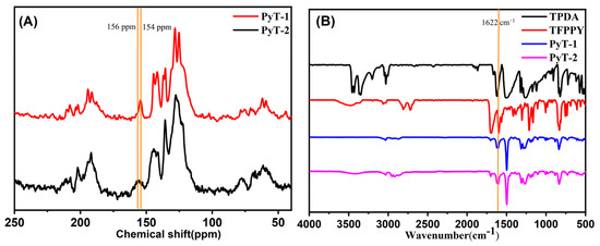 13C solid-state NMR spectra of (A) PyT-1 and PyT-2; FTIR spectra of (B) TPDA, TFPPY, PyT-1, and PyT-2.