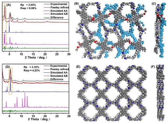 Experimental, simulated, and Pawley-refined PXRD of the PyT-1 crystal structure on the basis of the AB slipped stacking forms (A), top view (B) and side view (C) of the slipped AB stacking form of PyT-1 based on PXRD and modeling; experimental, simulated, and Pawley-refined PXRD of the PyT-2 crystal structure on the basis of the AA slipped stacking forms (D), top view (E), and side view (F) of the slipped AA stacking form of PyT-2 based on PXRD and modeling.