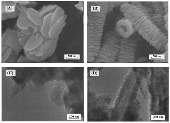SEM and TEM images showed that PyT-1 exhibited a randomly distributed nanosheet morphology with an average diameter of 200 nm (Figure 3A,C and Figure S2), while PyT-2 exhibited a distinct tubular morphology, which was an ordered stacking with a nanosheet structure observed from the periphery (Figure 3B and Figure S3). TEM images clearly demonstrated the hollow nature and rough surface of the tubes (Figure 3D).