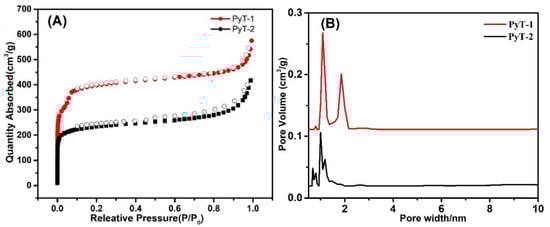 N2-capture desorption isotherms of PyT-1 and of PyT-2 (A); pore size distribution of PyT-1 and of PyT-2 (B).