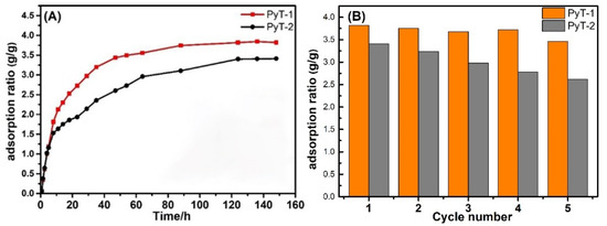 Iodine vapor adsorption capacities of PyT-1 and PyT-2 under 75 °C and ambient pressure (A) and adsorption capacities of PyT-1 and PyT-2 upon cycling (B).