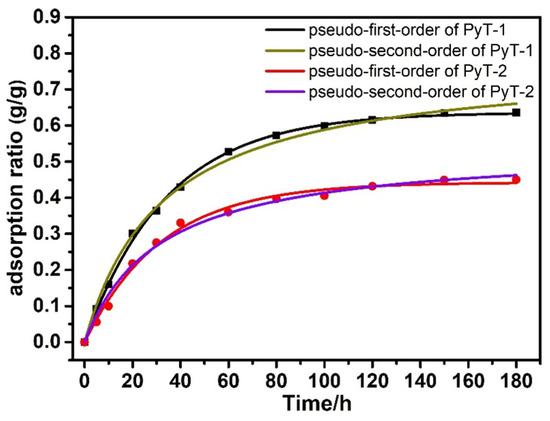 In order to explore the adsorption capacity of the COFs in the organic solution system, we conducted experiments with iodine adsorption solutions. The experiments were performed in n-hexane at room temperature. Iodine-containing solutions at concentrations of 400 mg L−1 and 200 mg L−1 were prepared. The residual iodine concentration was measured at 523 nm with an ultraviolet spectrophotometer (Figure S7). The adsorption limit q of PyT-1 reached up to 0.365 g g−1 in 200 mg L−1 of iodine solution, and the adsorption limit q of PyT-2 reached up to 0.315 g g−1 (Figure S6). The adsorption limit q of PyT-1 reached up to 0.635 g g−1 in 400 mg L−1 of the iodine solution, and the adsorption limit q of PyT-2 reached up to 0.445 g g−1 (Figure 6). It can be seen that the adsorption value rapidly increased in the first 40 min, and the adsorption equilibriums were reached within 180 min. The pseudo-first-order and pseudo-second-order kinetic models were used to explore the adsorption kinetics. The experimental data fitted well to the pseudo-second-order adsorption kinetics model with a good correlation coefficient (R2 = 0.998), demonstrating that the adsorption process of PyT-1 to iodine followed the pseudo-second-order kinetic model.